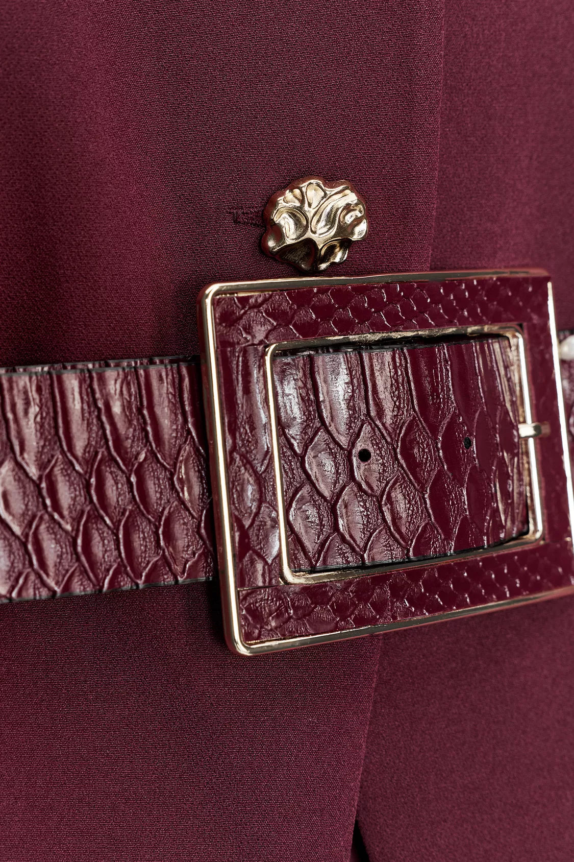 Burgundy V-neck dress with sleeveless design. Features a satin skirt with elasticated waist at the front and a belt. Front fastening with gold buttons.